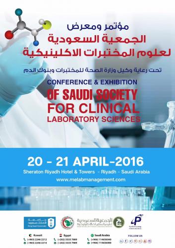 يسعدنا دعوتكم لحضور مؤتمر ومعرض الجمعية السعودية لعلوم المختبرات الإكلينيكية تحت رعاية وكيل وزارة الصحة للمختبرات وبنوك الدم خلال الفترة من 13-14/7/1437 هجري الموافق 20-21أبريل2016