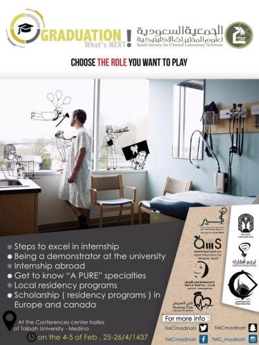 أقامت الجمعية السعودية لعلوم المختبرات الإكلينيكية بالتعاون مع نا دي جامعة طيبة الطبي مؤتمر عن الفرص المتاحة لخريجي المختبرات بعد التخرج وأقيم المؤتمر بجامعة طيبة بتاريخ 25/26-4-1437هجري